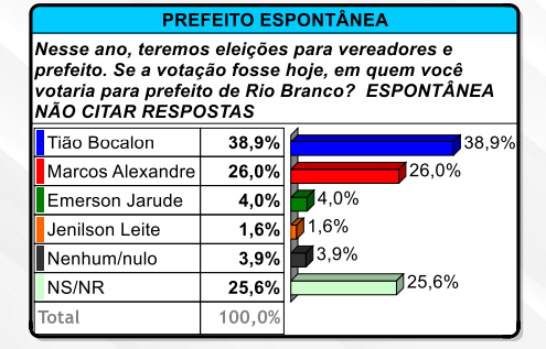 Na pesquisa espontânea, que não apresenta opções de resposta aos eleitores, Bocalom lidera com 38,9%, seguido por Marcus Alexandre com 26,0%, Jarude com 4,0% e Jenilson Leite com 1,6%. Além disso, 3,9% disseram que votarão nulo, e 25,6% não souberam responder.