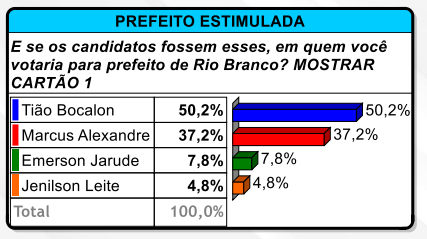 Na pesquisa estimulada, considerando os votos válidos, Bocalom registrou 50,2%. Marcus Alexandre aparece em segundo lugar, com 37,2%. Jarude pontuou 7,8%, e Jenilson Leite 4,8%.