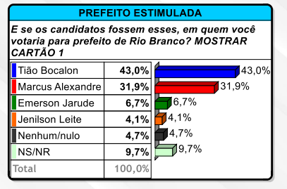 Ainda na estimulada, quando são consideradas as categorias “nulo” e “não souberam responder” ou “não responderam”, os números foram: Bocalom com 43,0%; Marcus Alexandre com 31,9%; Jarude com 6,7%; Jenilson com 4,1%; nulo com 4,7%; e “não souberam responder” ou “não responderam” com 9,7%.