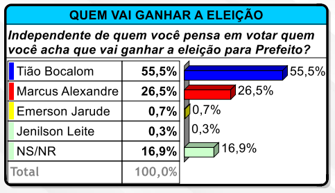 Também foi perguntado aos entrevistados quem eles acreditam que vencerá as eleições, independentemente de seus votos. Para 55,5%, Bocalom será o vencedor. Outros 26,5% apostam em Marcus Alexandre, 0,7% acreditam na vitória de Jarude, e 0,3% na de Jenilson. Já 16,9% não souberam responder ou não sabem.