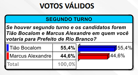 Quando questionados sobre um possível segundo turno entre Bocalom e Marcus Alexandre, 55,4% dos entrevistados disseram que votariam em Bocalom, enquanto 44,6% optariam por Marcus Alexandre.