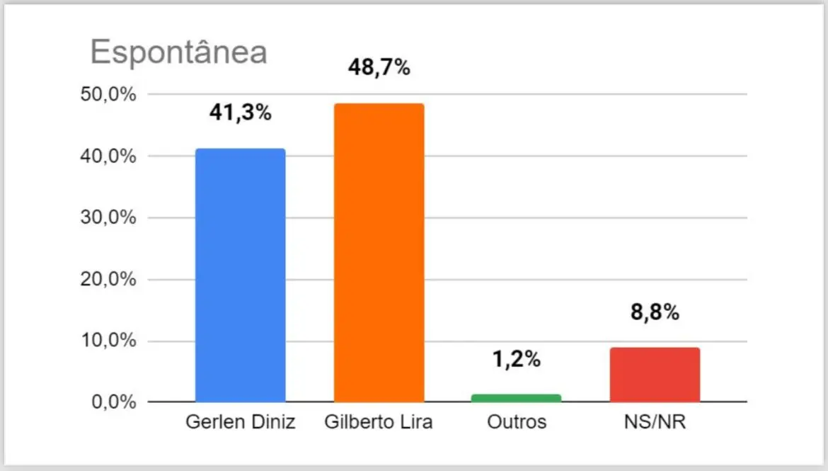 Nos números espontâneos, o deputado estadual Gilberto Lira, do União Brasil, tem 48,7% contra 41,3%, do deputado federal Gerlen Diniz, do Progressistas.