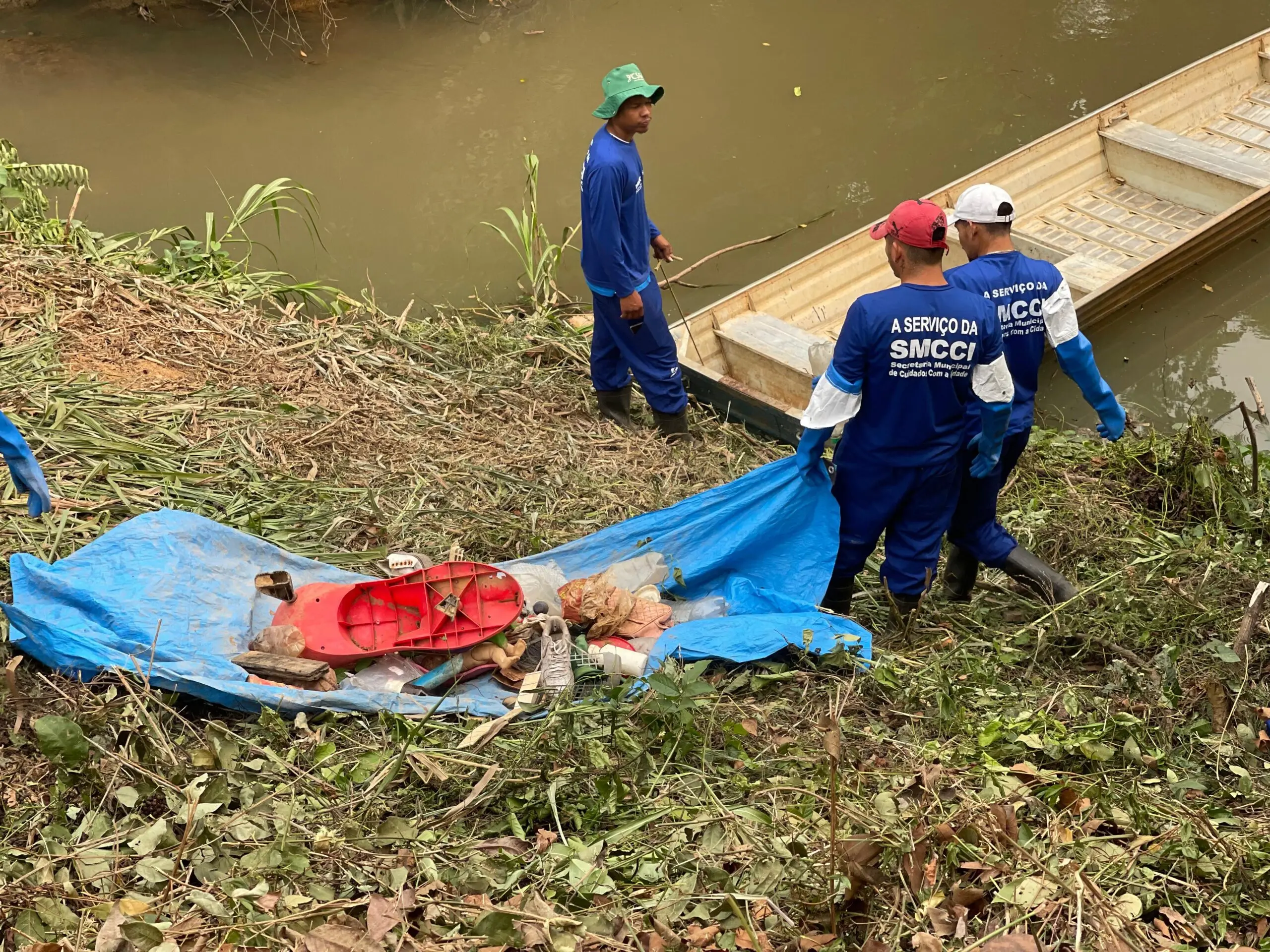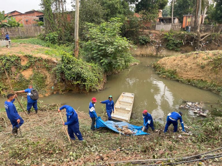 Diariamente, juntando equipes da Secretaria de Cuidados com a Cidade e de Meio Ambiente, cerca de 30 pessoas estarão em campo realizando a limpeza na margem e leito do Igarapé.