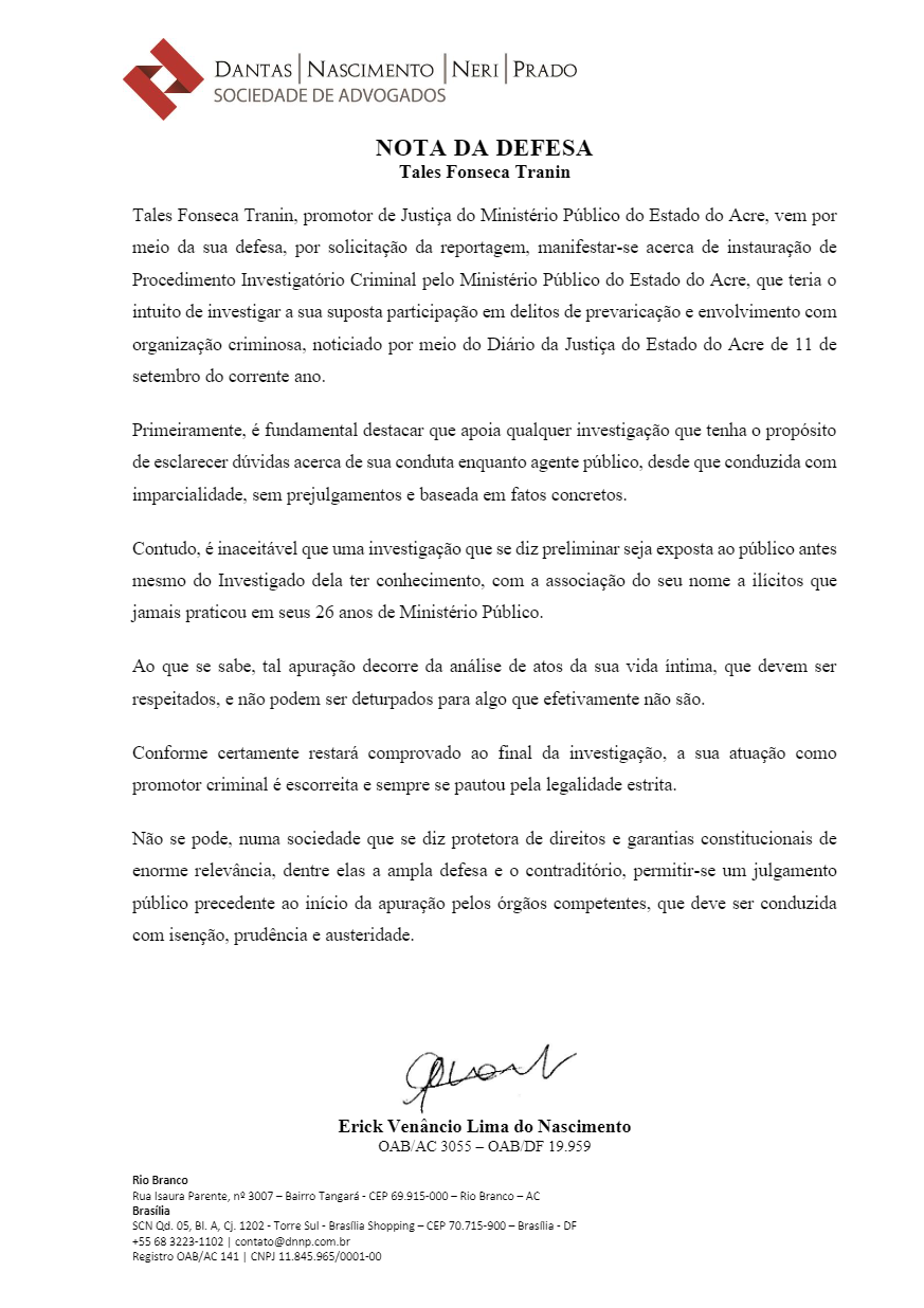 O ContilNet tentou contato com o advogado de Tranin, o jurista Erick Venâncio, que enviou uma nota pública sobre o caso, repudiando a divulgação do nome do promotor antes de concluído o processo de investigação.