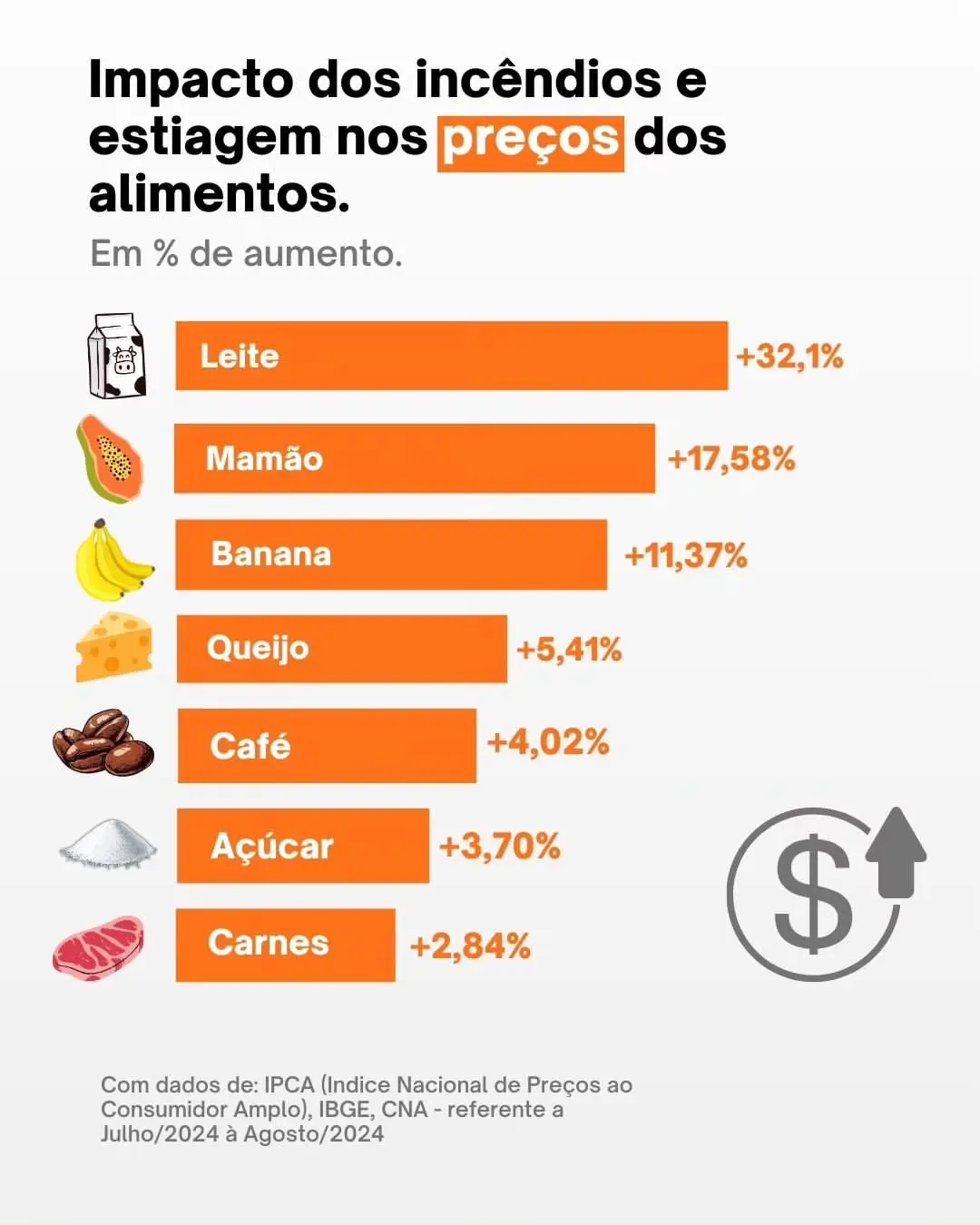 Os impactos das queimadas e da estiagem têm refletido diretamente no aumento dos preços de diversos alimentos essenciais no prato dos brasileiros em 2024.
