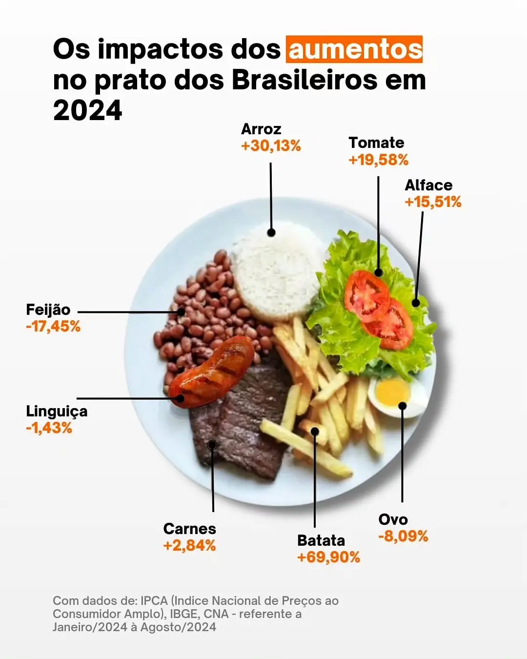 O arroz, por exemplo, teve uma alta significativa de 30,13%, seguido pelo tomate (19,58%) e a alface (15,51%). Em contrapartida, alguns produtos apresentaram redução de preços, como o feijão, com queda de 17,45%, e o ovo, com diminuição de 8,09%. Já a batata, um dos alimentos mais afetados, disparou com um aumento de 69,90%.