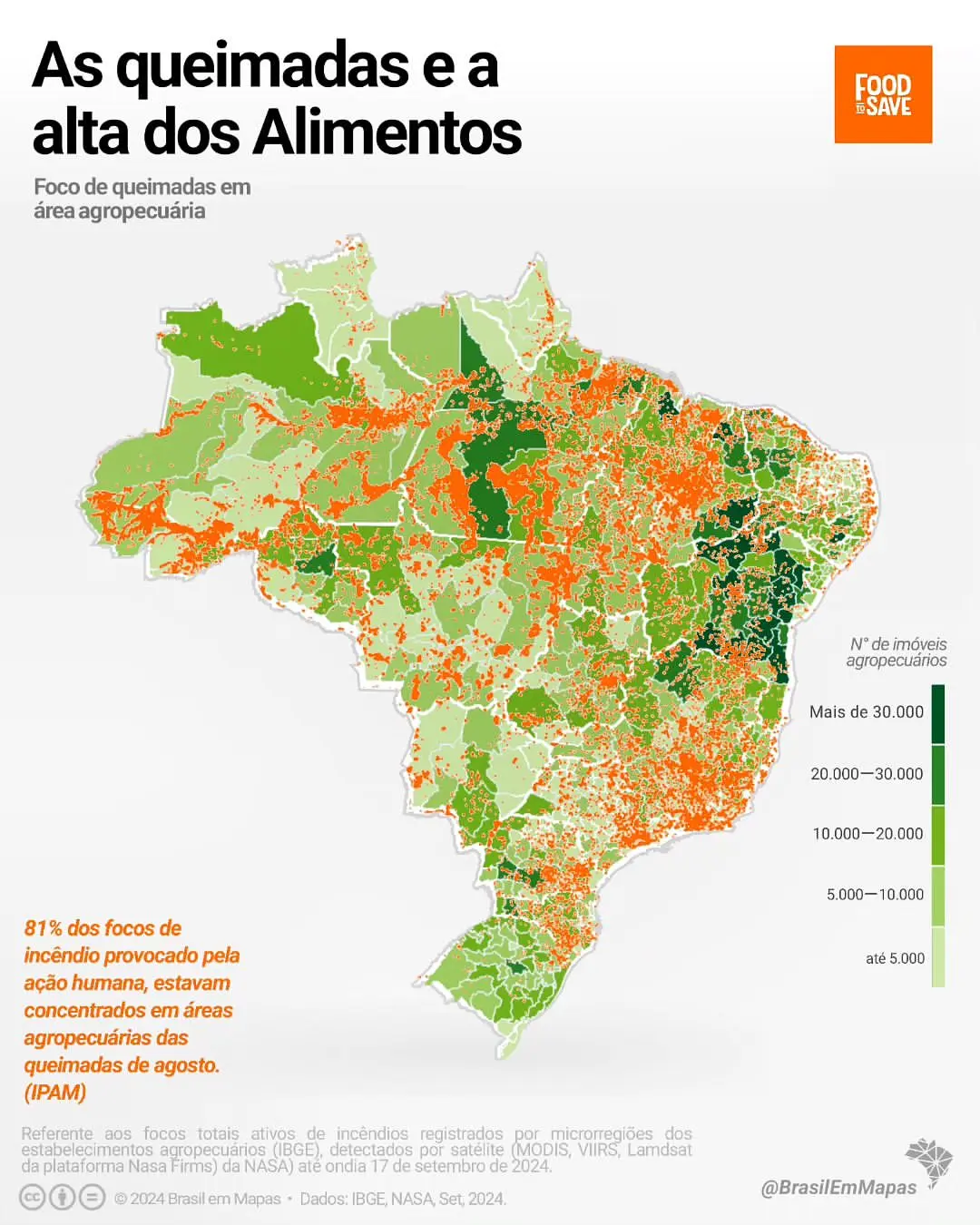 “As queimadas e a alta dos alimentos: Foco de queimadas em área agropecuária”: o mapa mostra a distribuição dos focos de queimadas em áreas agropecuárias no Brasil até setembro de 2024, com destaque para as regiões mais afetadas. O Acre e outras áreas da Amazônia apresentam uma alta concentração de incêndios, prejudicando a produção de alimentos e aumentando o preço dos produtos no mercado.