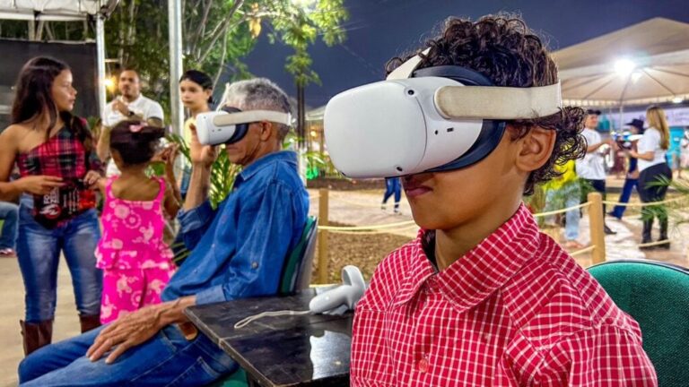 Durante a Expoacre, a Secretaria de Estado do Meio Ambiente (Sema) e o Instituto do Meio Ambiente do Acre (Imac), em parceria com a Secretaria de Estado de Educação e Cultura (SEE), estão promovendo, por meio das equipes da Educação Ambiental, uma experiência imersiva com o uso de óculos de realidade virtual (VR) para sensibilizar a população sobre os impactos dos eventos climáticos extremos no Rio Acre.
