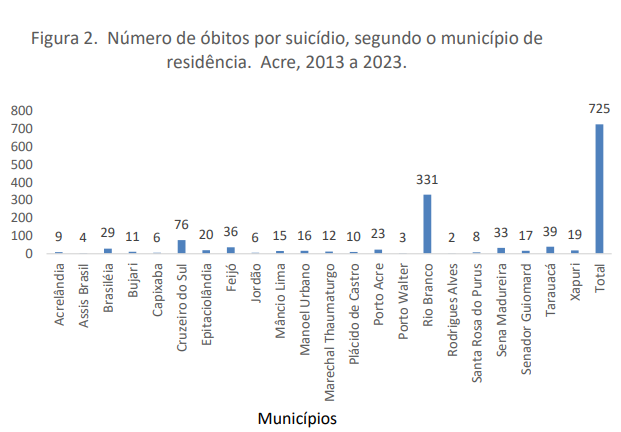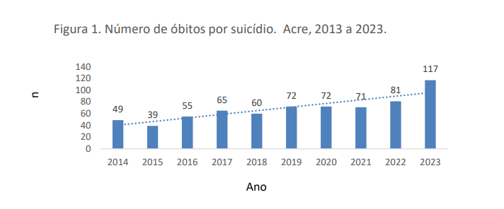 O Acre registrou 725 mortes por suicídio, conforme dados do Boletim Epidemiológic da Vigilância da Violência Autoprovocada/Suicídios (SIM e SINAN), entre 2013 e 2023. Foram 117 óbitos, em 2023, um aumento de 44% em relação ao ano anterior.