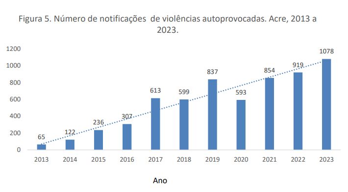 Em 2023, foram registrados 1.078 casos. Rio Branco, Cruzeiro do Sul e Brasiléia lideram as notificações de violência autoprovocada, com 69,5%, 8,5% e 7,3%, respectivamente.