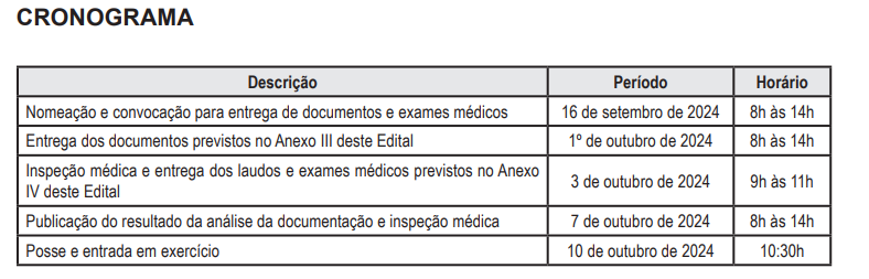 A fase seguinte consiste na entrega de exames médicos e laudos à Junta Médica do Poder Judiciário. A inspeção está prevista para o dia 3 de outubro. É importante ressaltar que a data de emissão desses não pode ser anterior a 180 dias. A posse dos aprovados acontecerá no dia 10 de outubro, às 9h no Plenário do Tribunal.