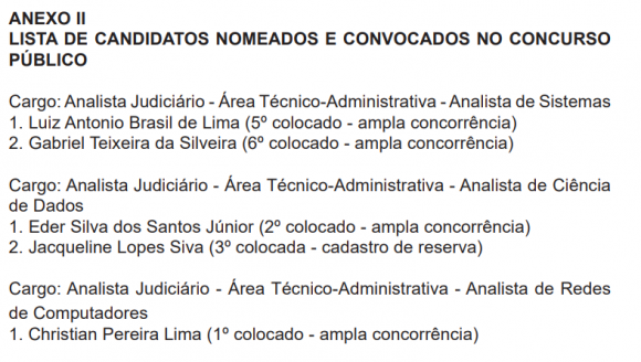 Foram chamados mais cinco analistas judiciários da área técnico-administrativa, sendo dois analistas de sistemas, dois analistas de Ciência de Dados e um analista de rede de computadores. Confira a lista:
