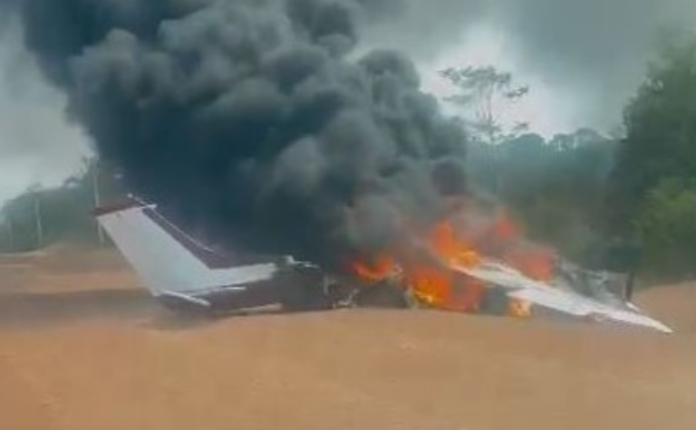 Avião de pequeno porte em chamas após queda na BR-319, próximo ao distrito de Realidade, em Rondônia/Foto: Reprodução