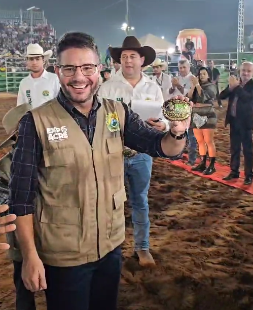 O primeiro a receber a medalha foi o governador Gladson Cameli das mãos dos seguranças dos peões que estão presentes na grande final da competição.