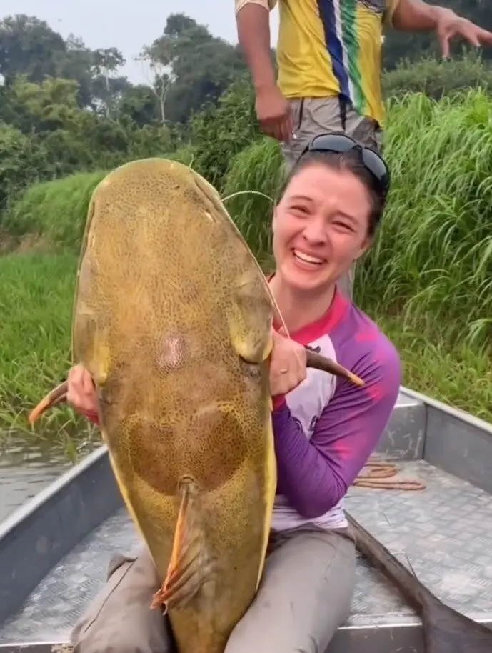 Nas imagens, a pescadora aparece vibrante em meio a resistência do peixe, que estava enroscado. Com muito esforço, ela consegue erguer a pirarara, exibindo-a com um sorriso de felicidade e satisfação.