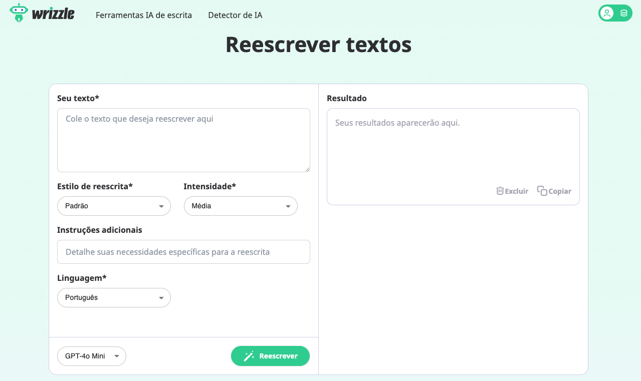O que torna o reescritor do Wrizzle particularmente atraente é sua flexibilidade. Com oito modos de reescrita predefinidos – incluindo padrão, fluente, formal, acadêmico, criativo, simplificado, encurtado e expandido – os usuários podem adaptar facilmente o tom e o estilo do texto às suas necessidades específicas. Além disso, para quem busca um controle ainda maior, existe a opção de inserir instruções personalizadas para guiar o processo de reescrita.