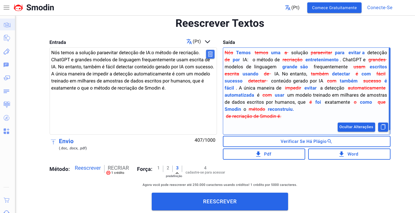 A função de reescrita do Smodin é dividida em dois modos: Reescrever e Recriar. O modo Recriar é particularmente notável, pois além de reescrever o texto, ele também elimina automaticamente indícios de plágio e características típicas de textos gerados por IA, tornando o resultado mais semelhante à escrita humana. Esse processo pode até passar por um detector de IA, garantindo que o conteúdo recriado não seja facilmente identificado como gerado por IA. Os usuários podem visualizar claramente quais palavras foram substituídas ou adicionadas, facilitando ajustes posteriores. Além disso, o Smodin oferece uma função de detecção de plágio rápida e fácil para garantir a originalidade do conteúdo reescrito.
