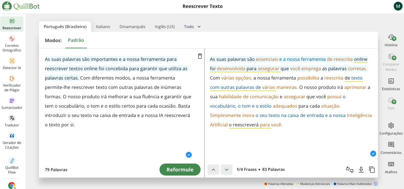 Uma das características mais notáveis do QuillBot é sua variedade de modos de paráfrase. Para usuários gratuitos, estão disponíveis os modos Padrão e Fluência, permitindo reescrever até 125 palavras por vez. Já os assinantes Premium desbloqueiam a capacidade de reescrever textos sem limite de palavras, além de uma gama completa de opções de estilo. Além disso, a ferramenta oferece um recurso visual interessante: as palavras alteradas, as mudanças estruturais e as partes inalteradas do texto são destacadas em cores diferentes, permitindo que você compreenda facilmente as transformações realizadas.