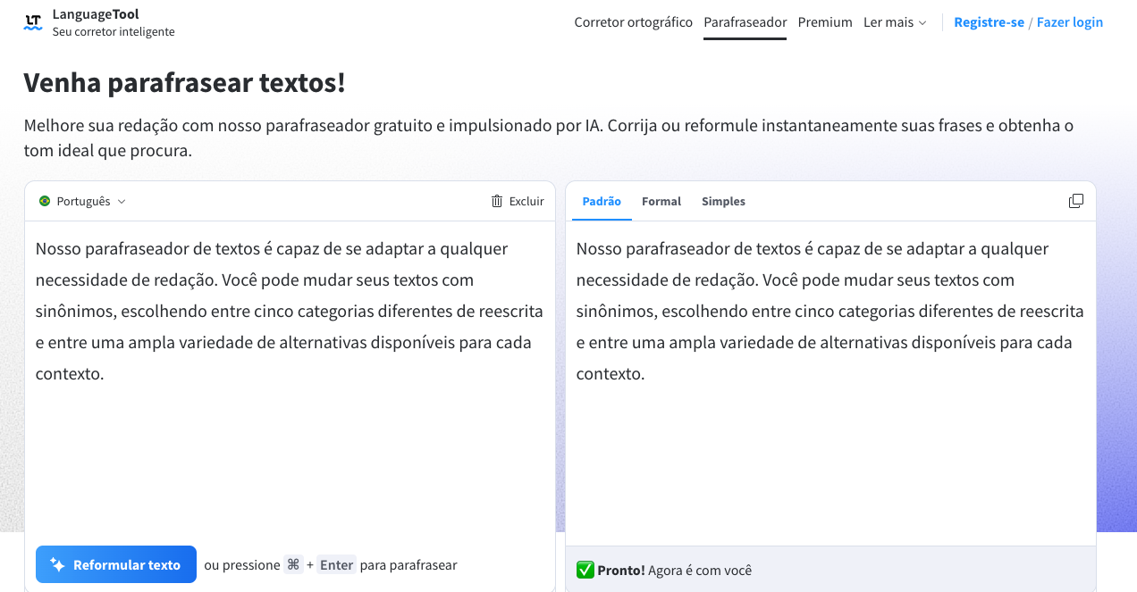 Esta nova ferramenta de paráfrase está disponível em seis idiomas principais: português, inglês, alemão, francês, espanhol e holandês. O parafraseador utiliza inteligência artificial para reescrever textos, oferecendo três estilos distintos: padrão, formal e simples. Assim, não apenas corrige erros, mas também eleva a qualidade e a adequação do texto ao contexto desejado.