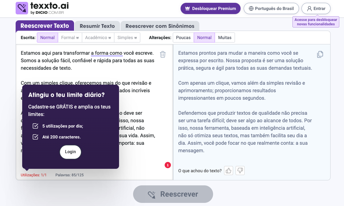O destaque desta ferramenta está em suas três funcionalidades principais: reescrita de texto, resumo de texto e substituição por sinônimos. Na função de reescrita, os usuários podem escolher entre quatro estilos diferentes – normal, formal, acadêmico ou simples – e ajustar o nível de alterações para pouco, normal ou muito, proporcionando uma flexibilidade notável. Vale ressaltar que a versão gratuita do Texxto.ai permite aos usuários realizar 5 operações por dia, com um limite de 40 palavras por vez, o que já é bastante prático para uso cotidiano.