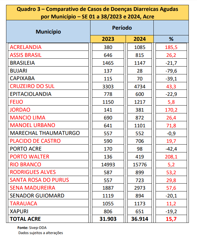 Segundo o último boletim divulgado pela Secretaria de Estado de Saúde do Acre (Sesacre), no mesmo período em 2023 foram notificados 31.903 casos, registrando um aumento de 15,7%, ou seja, 5.011 casos.
