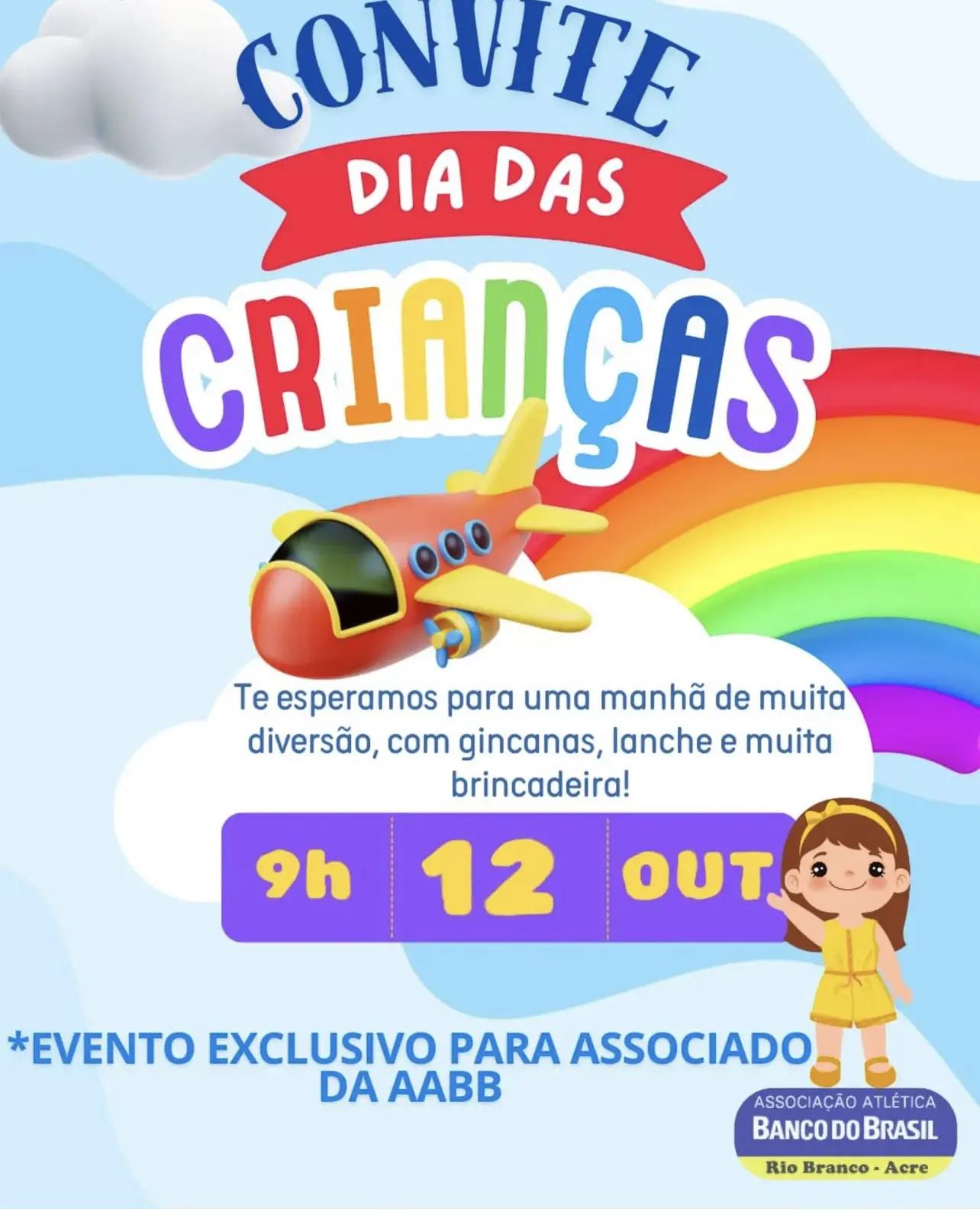 A Associação Atlética Banco do Brasil- AABB realiza o dia das crianças a seus associados no dia 12 de outubro a partir das 9h com muita diversão, gincanas, lanches e muitas brincadeiras.