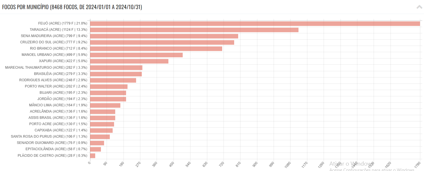 Em relação aos municípios, Feijó segue liderando o ranking com os maiores registros. Apenas nos 10 meses de 2024, o município teve 1779 focos.
