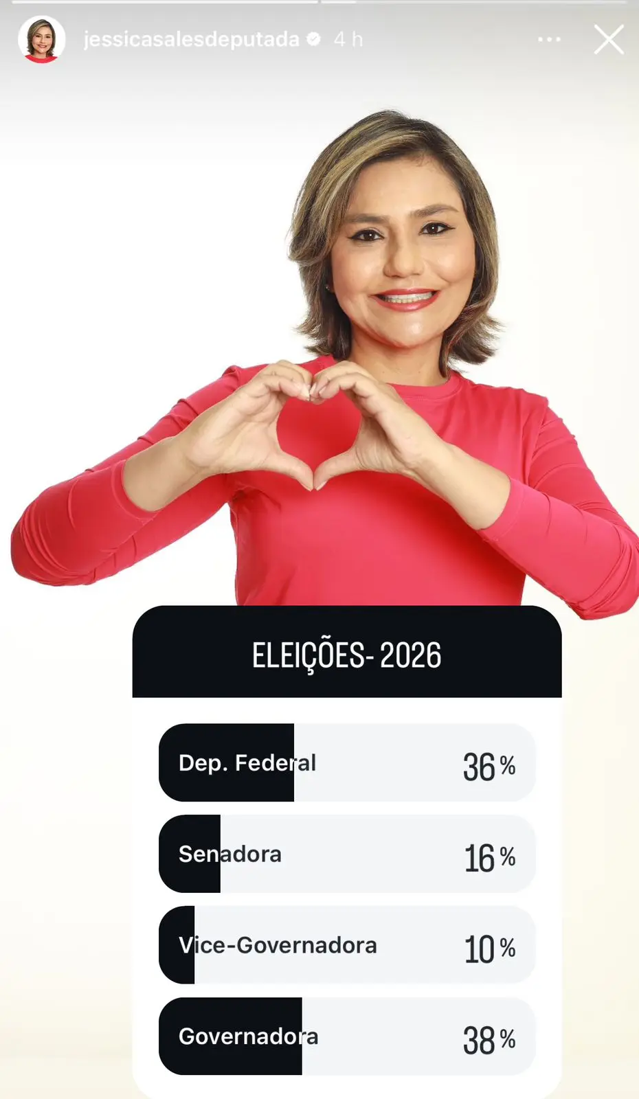 Até o momento, a opção que lidera é governadora, com 38%, seguido de deputada federal – cargo que ela já exerceu – com 36%, senadora, com 16% e por fim, vice-governadora, com 10%.