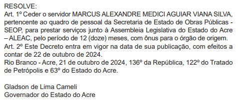 O governador Gladson Cameli, em decreto divulgado nesta quarta-feira (23), no Diário Oficial do Estado (DOE), cedeu o ex-prefeito de Rio Branco, Marcus Alexandre para prestar serviços à Assembleia Legislativa do Acre (ALEAC) por um período de 1 ano.