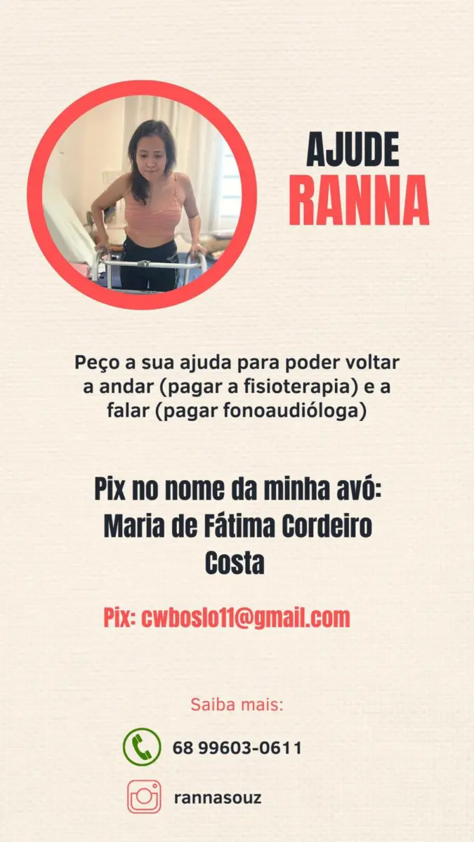 Ranna, ainda ficou duas vezes internada na Unidade de terapia intensiva. Agora em processo de recuperação, precisando de auxílio para voltar a andar, ela busca apoio das pessoas que se sentirem tocadas com seu caso.