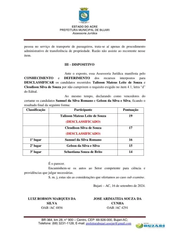 Uma denúncia enviada ao ContilNet informou que o pedido do MPAC surgiu após dois candidatos do edital ‘sem justificativa’. Um parecer assinado pela Assessoria Jurídica da Prefeitura do Bujari mostra que os dois candidatos foram desclassificados por não cumprirem o requisito exigido no item 4.1 do edital.