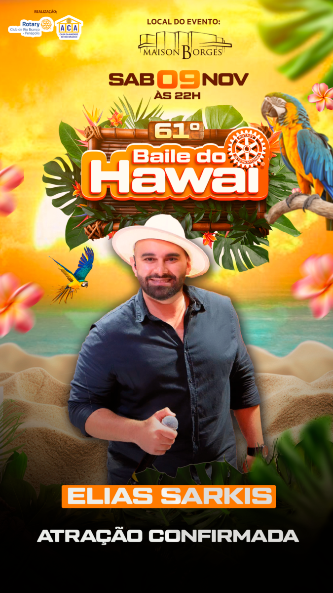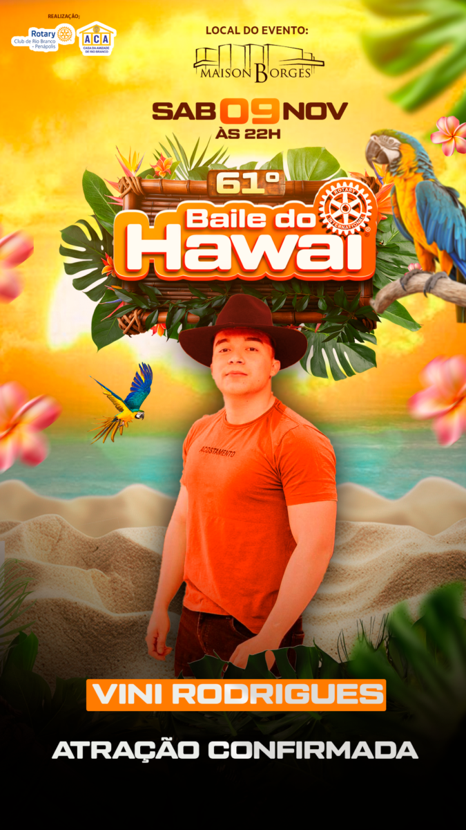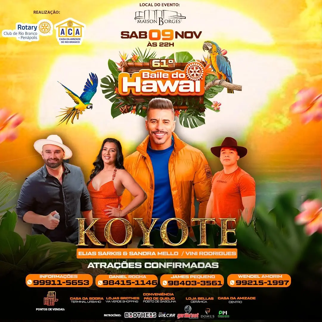 O cantor Koyote será a atração principal da 61ª edição do Baile do Hawai, organizado pelo Rotary Club de Rio Branco – Penápolis juntamente com a Casa da Amizade no próximo dia 9 de novembro. O evento será realizado na Maison Borges, em Rio Branco, prometendo uma noite memorável. Em mensagem gravada especialmente para os fãs acreanos, Koyote compartilhou sua empolgação para o show e mencionou que irá lançar novidades durante sua apresentação.