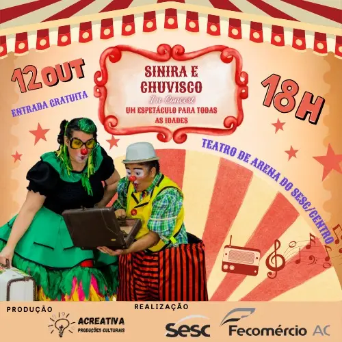 No Teatro de Arena do Sesc Centro, neste sábado (12), a criançada pode se divertir com Sinira e Chuvisco, com entrada gratuita, às 18h.