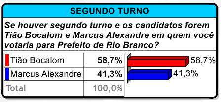 Os entrevistados também foram questionados sobre um eventual segundo turno entre Bocalom e Marcus. Considerando apenas os votos válidos, Bocalom aparece com 58,7% e Marcus registra 41,3%.
