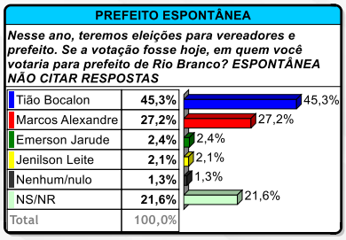 Os dados da pesquisa espontânea – em que os nomes dos candidatos não são apresentados – apontam que o atual prefeito e candidato à reeleição, Tião Bocalom, lidera com 45,3%,. Marcus Alexandre aparece em segundo, com 27,2%. Emerson Jarude é o terceiro colocado, com 2,4%. Jenilson segue em último lugar, com 2,1%. Nenhum/nulo pontou 1,3%; e 21,6% não souberam responder.