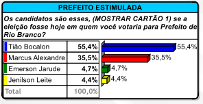 Na pesquisa estimulada, contando apenas os votos válidos, Bocalom aparece com 55,4%; Marcus com 35,5%; Jarude com 4,7%; e Jenilson com 4,4%.