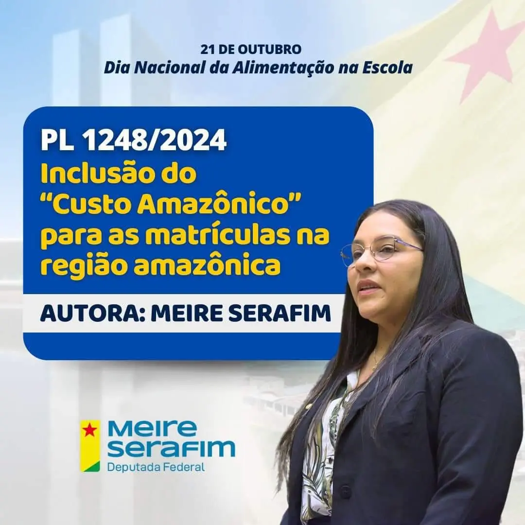A deputada federal Meire Serafim (União-AC) propôs um novo projeto de lei (PL 1248/2024) que visa introduzir o “custo amazônico” no cálculo das matrículas escolares para crianças da Região Norte do Brasil. O projeto, anunciado pela parlamentar em suas redes sociais, tem como objetivo compensar os desafios logísticos e geográficos enfrentados pelas escolas da região, garantindo, assim, um repasse de recursos mais adequado às necessidades locais.