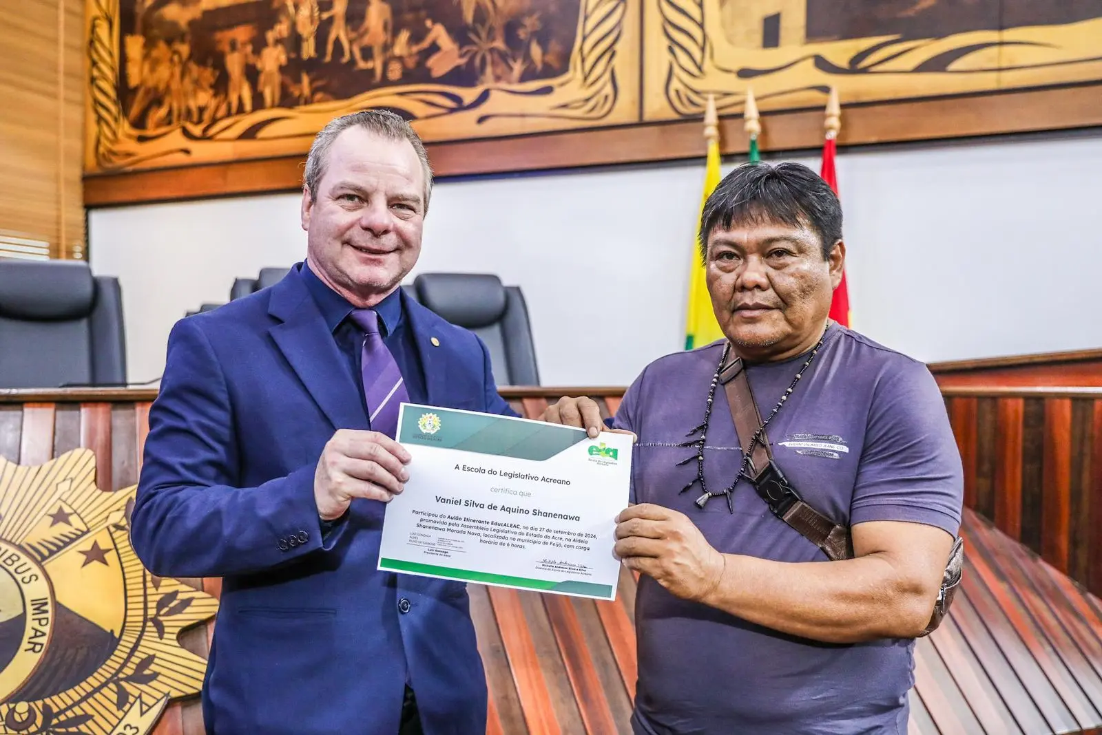 Os certificados dos estudantes que participaram do primeiro módulo do pré ENEM paras indígenas na Aldeia Morada Nova, em Feijó, foram entregues ao cacique Carlos Brandão Shanenawa, na manhã desta quarta-feira,2, no plenário da ALEAC.