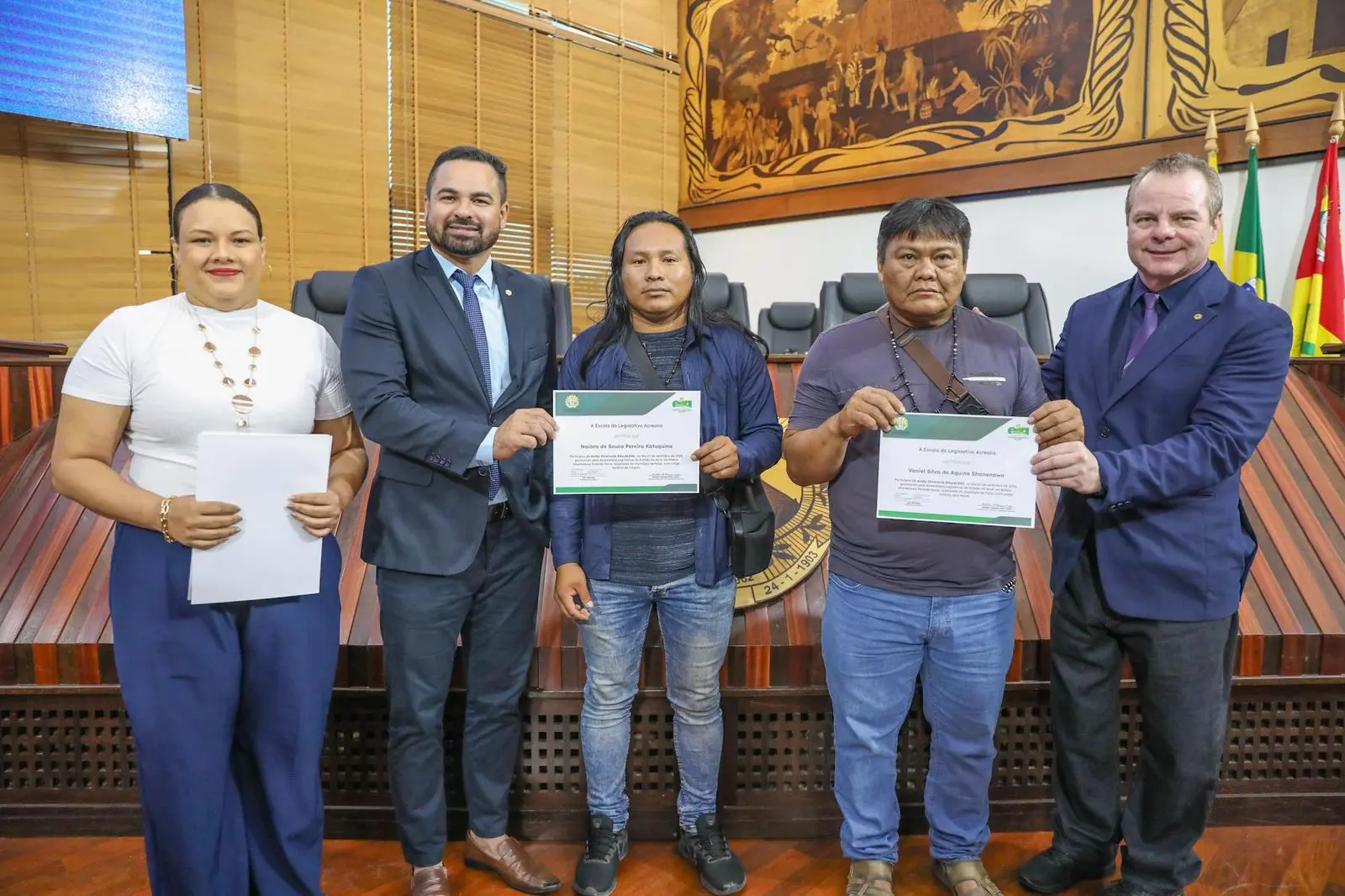 O presidente em exercício da Casa de Leis, Pedro Longo ( PDT), e o deputado Arlenilson Cunha (PL), ao lado da diretora da escola do Legislativo, Andressa Michelle Silva, entregaram 30 certificados ao líder indígena que estava acompanhado pelo curandeiro espiritual Xanupá Shane Shanenawa.