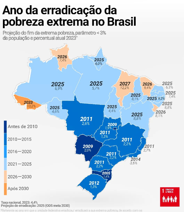 Mapa do Brasil destacando a projeção de erradicação da pobreza extrema por estado. Acre, com 13,2% da população vivendo em extrema pobreza, tem previsão de erradicação apenas em 2033/Foto: Reprodução