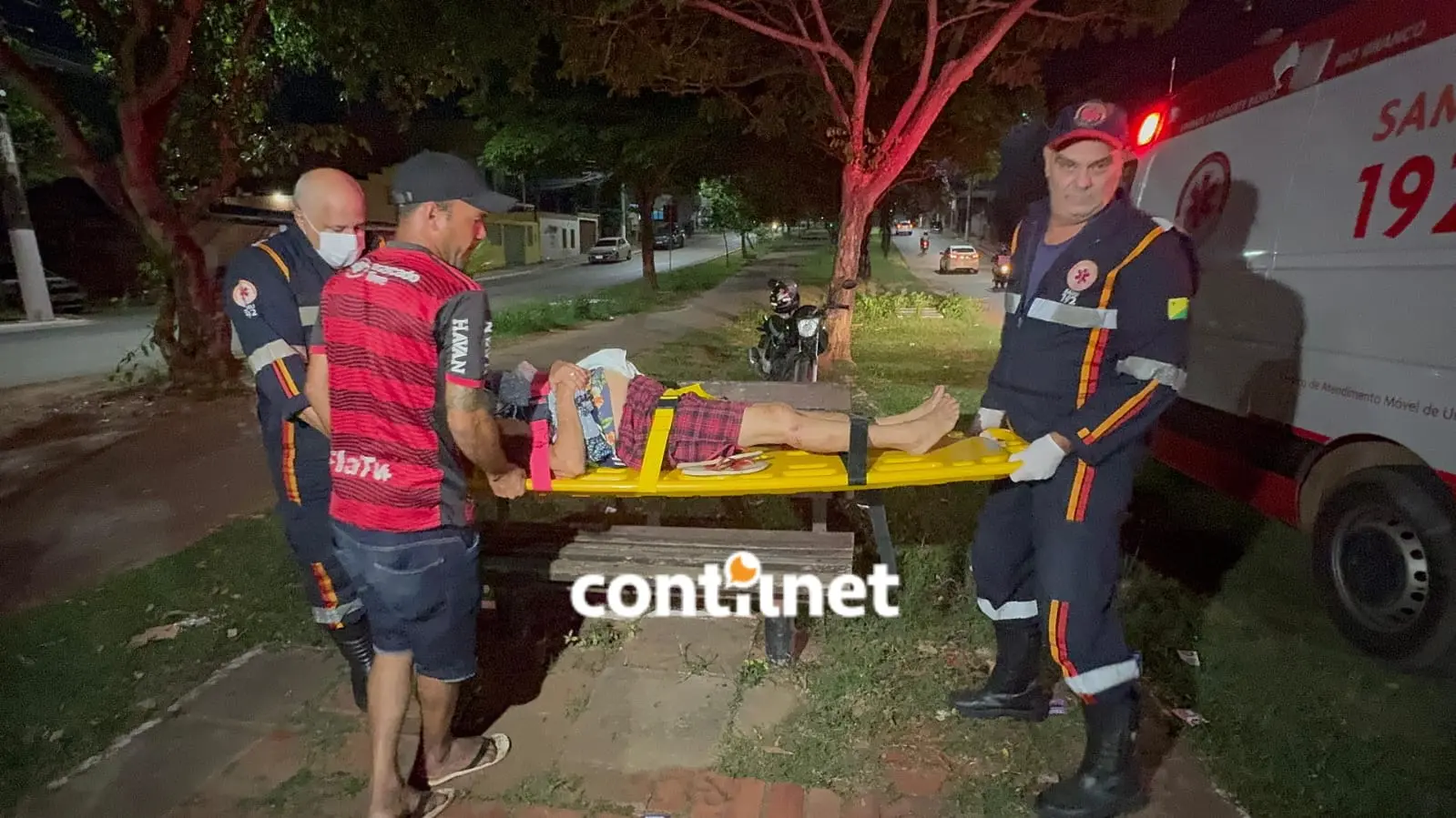 Idosa foi arremessada ao asfalto e bateu a cabeça, sofrendo um hematoma na testa, um ferimento no pé esquerdo e escoriações pelo corpo.