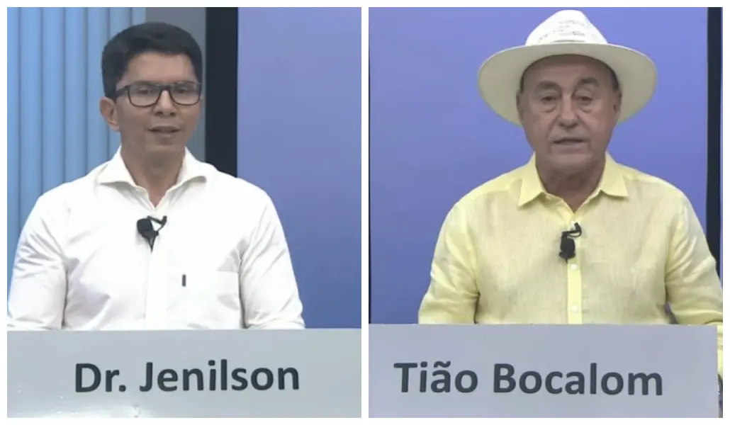 No debate, Jenilson Leite questiona Tião Bocalom sobre a gestão das queimadas em Rio Branco, enquanto o prefeito destaca medidas de mecanização agrícola e coleta de lixo para reduzir os focos de incêndio/Foto: Reprodução/TV Acre