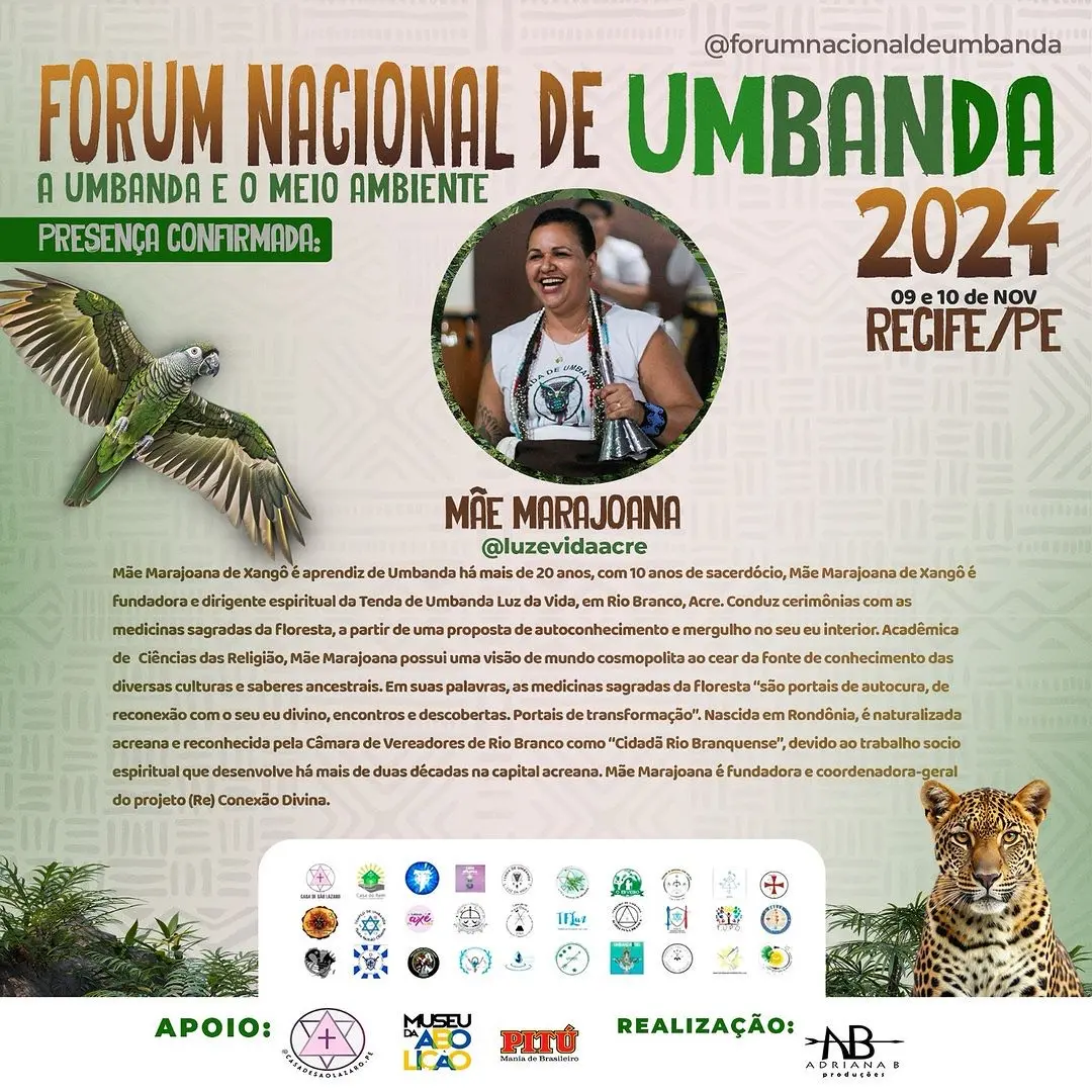 A segunda edição do Fórum Nacional de Umbanda e meio Ambiente será promovida nos dias 09 e 10 de novembro, em Recife (PE). Com o tema focado no meio ambiente, o evento nacional reúne pais e mães de santo de todas as regiões do Brasil. Representando o Norte do país e o Acre, a dirigente espiritual da Tenda Umbanda Luz da Vida, Mãe Marajoana de Xangô, está entre as falas mais guardadas do fórum, que neste ano se debruça sobre os impactos das mudanças climáticas. Mãe Marajoana compõe a programação oficial de falas do fórum e vai participar dos debates acompanhadas de seus filhos de santo.