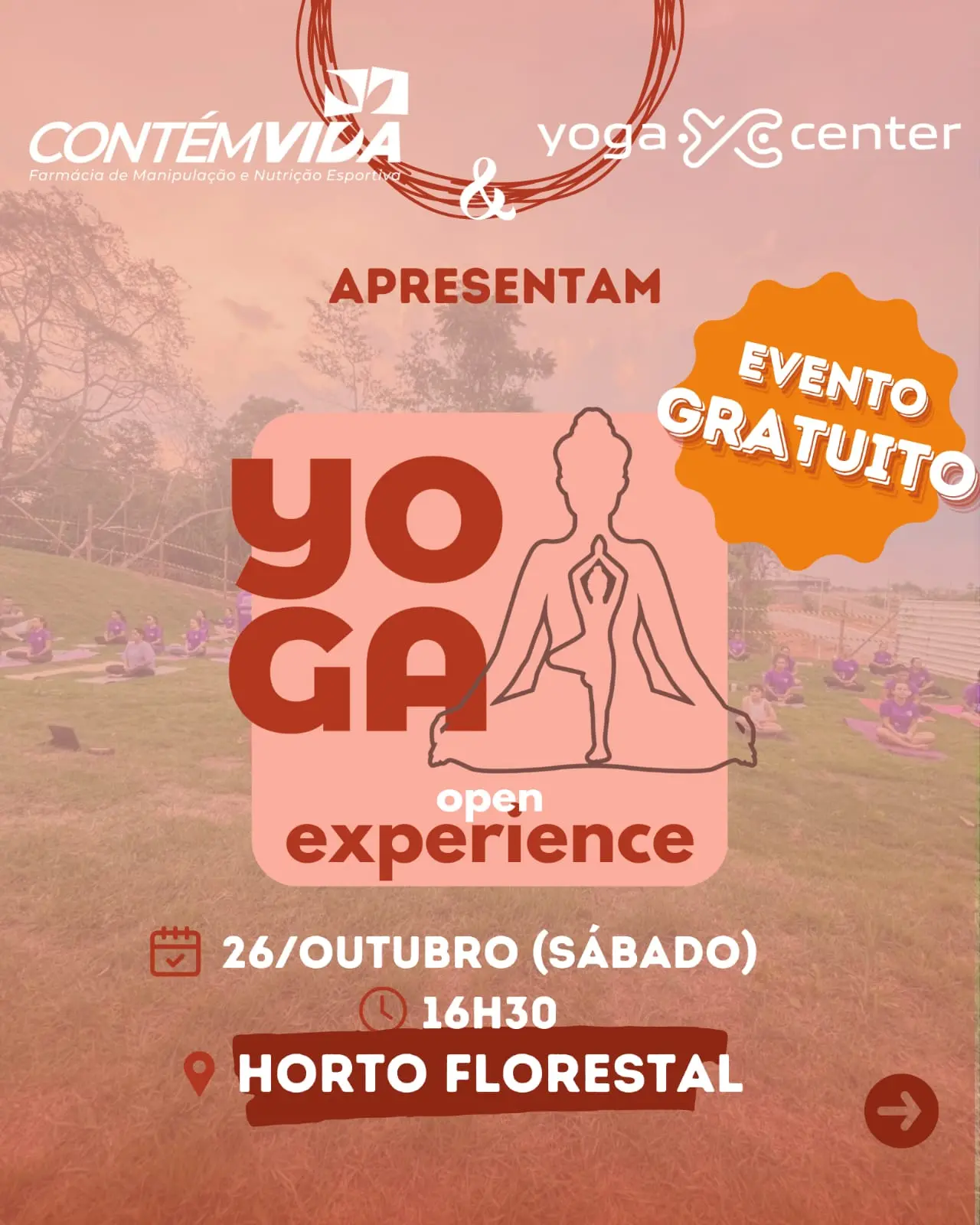Neste sábado, às 16h30, o Yoga Center realiza uma sessão especial de Yoga em um dos quiosques do Horto Florestal. Uma oportunidade perfeita para quem busca equilibrar corpo, mente e espírito, com o frescor da natureza ao redor. Prepare seu tapetinho e venha se conectar com a energia desse espaço encantador! Um encontro para renovar as energias e compartilhar boas vibrações. Namastê!