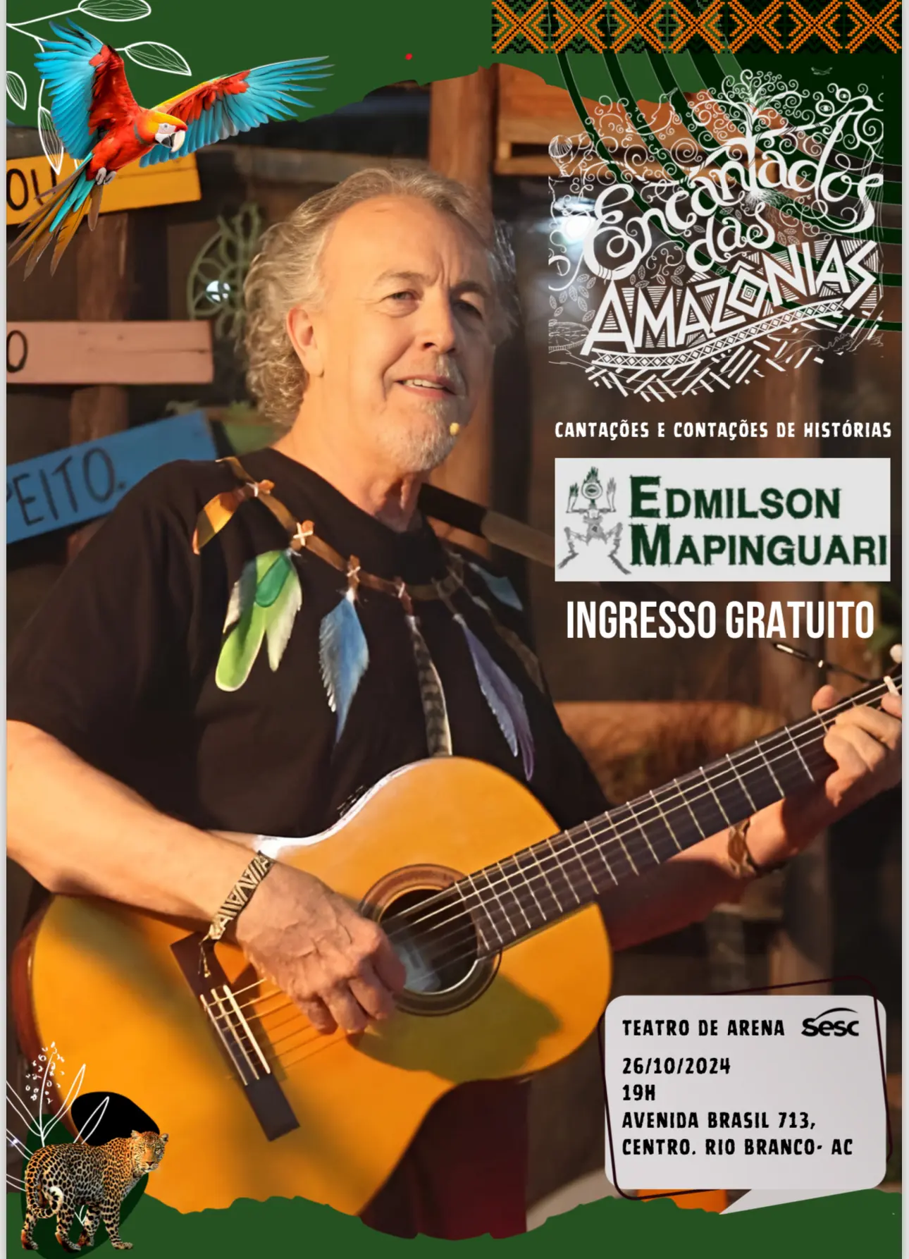 Encantados das Amazônias no Teatro de Arena do Sesc! Neste sábado, 26 de outubro, às 20h, o artista acreano Edmilson Mapinguari promete levar o público a uma verdadeira viagem pelos sons e lendas da Amazônia com seu espetáculo Encantados das Amazônias. Radicado em Brasília, Mapinguari retorna às suas raízes para uma apresentação especial, onde mistura música e histórias que celebram a rica cultura da floresta.