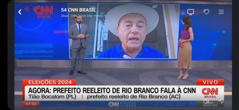 O prefeito de Rio Branco, reeleito no primeiro turno com 108.605 votos, o que representa 54,82% dos votos válidos, Tião Bocalom foi convidado a participar, nesta segunda-feira (8), por meio de videoconferência, do programa CNN Novo Dia.
