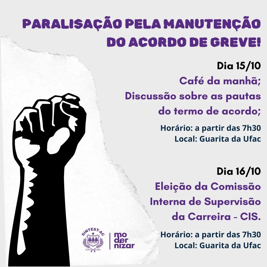 Conforme publicado pelo Sindicato dos Trabalhadores em Educação do Terceiro Grau do Acre – Sintest, a ação foi deliberada e acatada na última assembleia, que aconteceu dia 10 deste mês, e ocorrerá para o debate de pontos da manutenção do acordo feito com o governo federal após a greve que durou mais 3 meses neste ano.