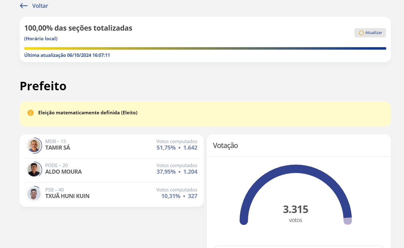 Com 51,75% dos votos, Tamir Sá, do MDB, foi reeleito prefeito de Santa Rosa do Purus. Ele conquistou 1.642 votos, derrotando os candidatos Aldo Moura, do PODEMOS, e Txuã Huni Kuin, do PSB, neste domingo (06).