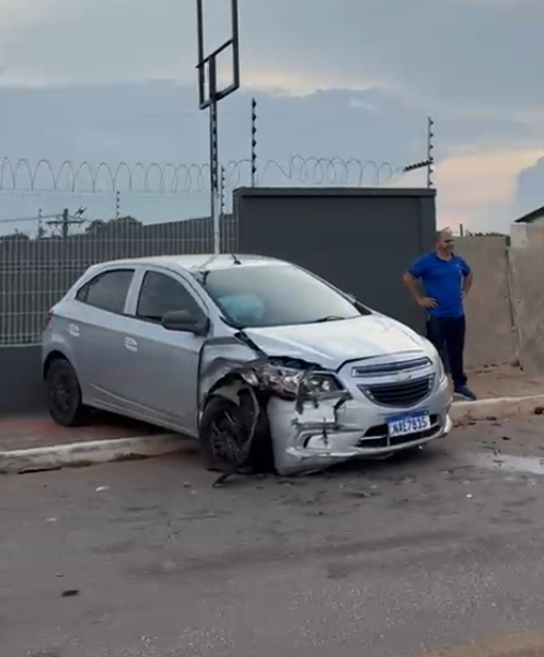 Um veículo do modelo Onix teve o seu capô completamente destruído na Avenida Nações Unidas, em Rio Branco, na tarde desta quinta-feira (31).