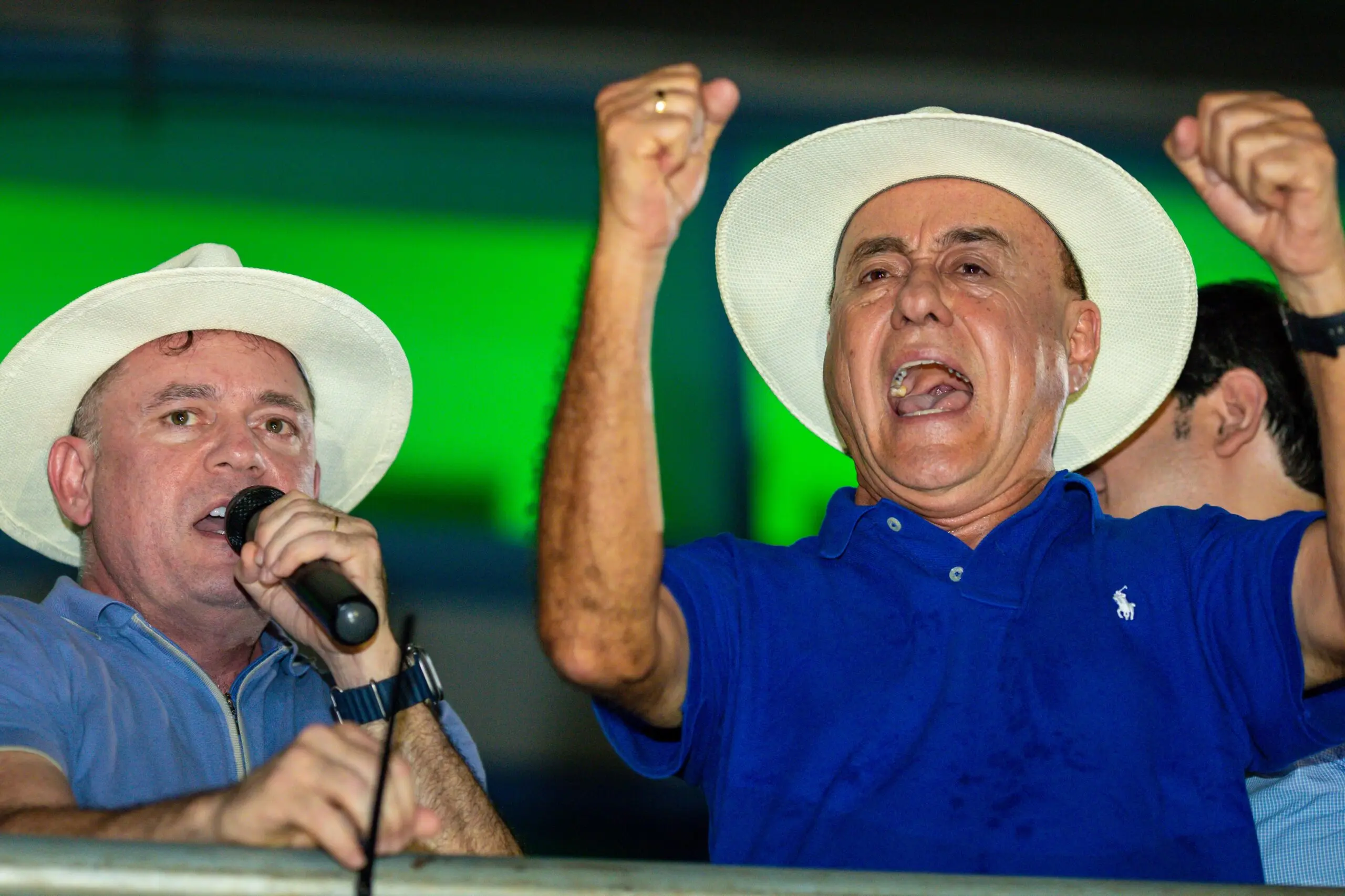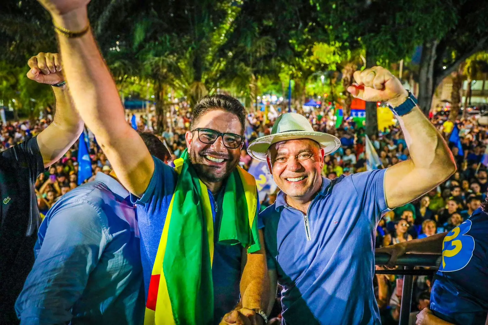 O prefeito Tião Bocalom seu vice, Alysson Bestene, foram recepcionados com muita festa por apoiadores e militantes durante chegada na comemoração pela reeleição à prefeitura de Rio Branco, realizada na Praça da Revolução, na noite deste domingo (6).